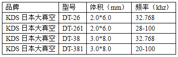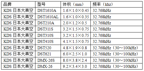 KDS晶体谐振器32.768KHZ系列的贴片晶振多以DST开头命名,市场上常用的封装有1.6*1.2mm,2.0*1.2mm,3.2*1.5mm,4.2*1.5mm,4.8*1.9mm,6.0*2.5mm(现今较少用),8.0*3.8mm,9.2*3.4mm,13.2*4.9mm。32.768KHZ系列的圆柱晶振多以DT开头命名,市场上常用的封装有2.0*6.0mm,3.0*8.0mm。