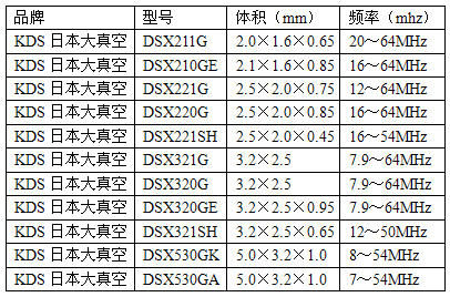 KDS晶振除了32.768K晶振,MHZ的晶振用途更为广泛,常用的MHZ晶振频率有8M、11.0592M、12M、13.56M、14.7458M、16M、19.2M、20M、22.1184M、22.5792M、24M、24.576M、25M、26,27M、32M、40M等,常用的贴片晶振规格尺寸有:2.0*1.6mm,2.0*2.5mm,3.2*2.5mm,5.0*3.2mm,6.0*3.5mm,5.0*7.0mm。KDS晶振MHZ系列产品多以DSX命名,数字以O结尾,晶振脚位则为2脚;数字以0以外的数字结尾,晶振脚位则为4脚。型号尾缀以GA或者G结尾,晶振表面为陶瓷面;型号尾缀以S或者SL,SH结尾,晶振表面为金属面。